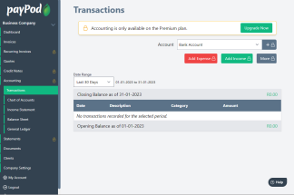 - Chart of accounts to manage banks accounts, income/expense categories and liabilities such as credit cards.