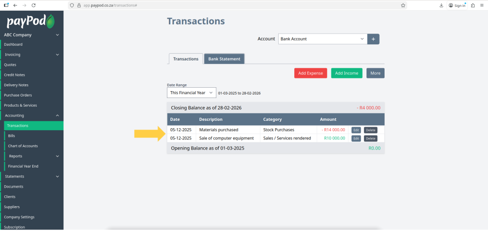 You can edit or delete transactions using the buttons to the right of the transaction.